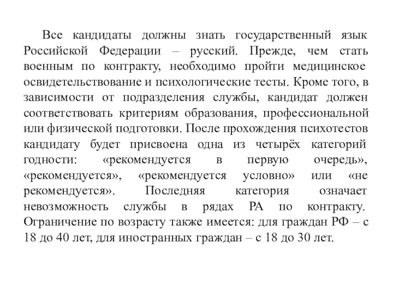 чем стать военным по контракту, необходимо пройти медицинское освидетельствование и психологические тесты. Кроме того, в зависимости от подразделения службы, кандидат должен соответствовать критериям образования, профессиональной или физической подготовки. После прохождения психотестов кандидату будет присвоена одна из четырёх категорий годности: «рекомендуется в первую очередь», «рекомендуется», «рекомендуется условно» или «не рекомендуется». Последняя категория означает невозможность службы в рядах РА по контракту. Ограничение по возрасту также имеется: для граждан РФ – с 18 до 40 лет, для иностранных граждан – с 18 до 30 лет.