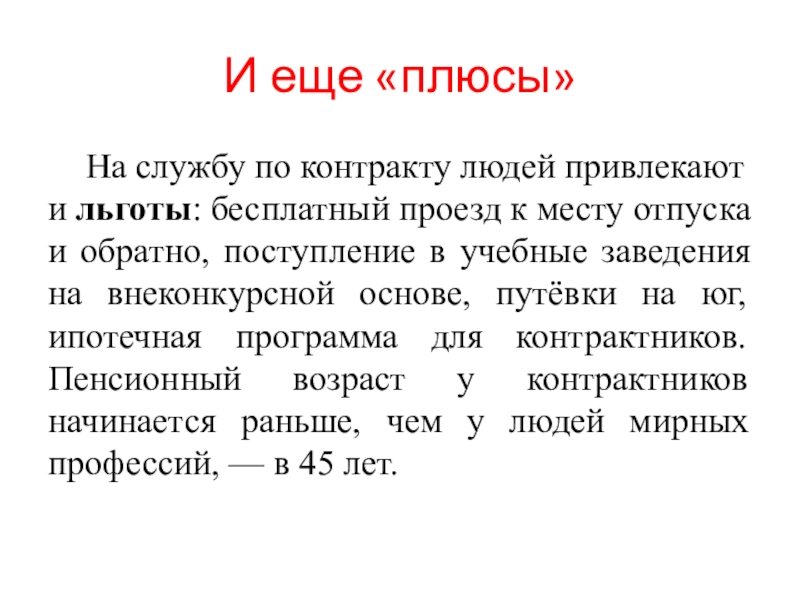 проезд к месту отпуска и обратно, поступление в учебные заведения на внеконкурсной основе, путёвки на юг, ипотечная программа для контрактников. Пенсионный возраст у контрактников начинается раньше, чем у людей мирных профессий, — в 45 лет.