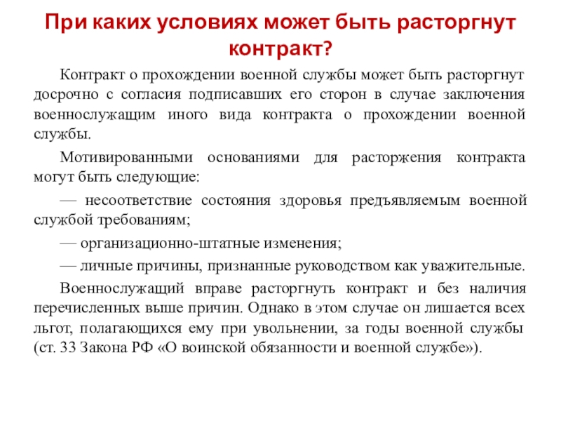 Военнослужащий вправе расторгнуть контракт и без наличия перечисленных выше причин. Однако в этом случае он лишается всех льгот, полагающихся ему при увольнении, за годы военной службы (ст. 33 Закона РФ «О воинской обязанности и военной службе»).
