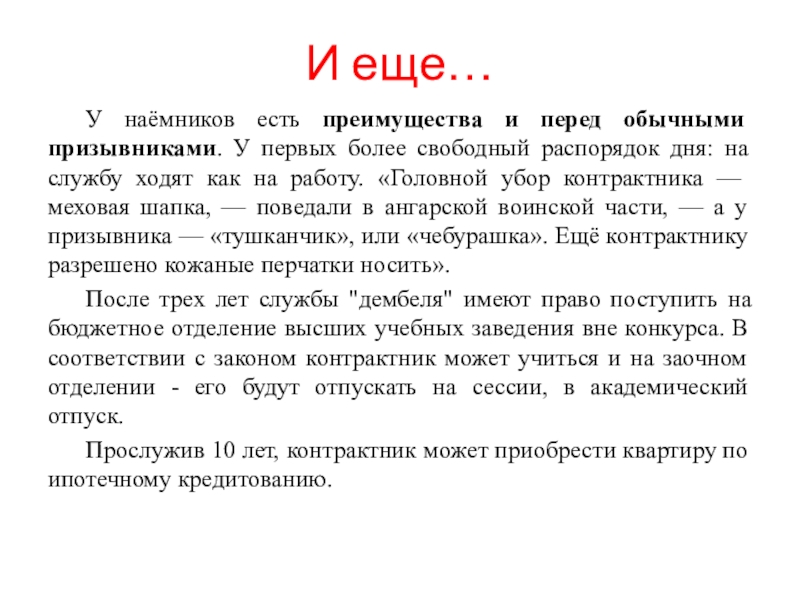 более свободный распорядок дня: на службу ходят как на работу. «Головной убор контрактника — меховая шапка, — поведали в ангарской воинской части, — а у призывника — «тушканчик», или «чебурашка». Ещё контрактнику разрешено кожаные перчатки носить».