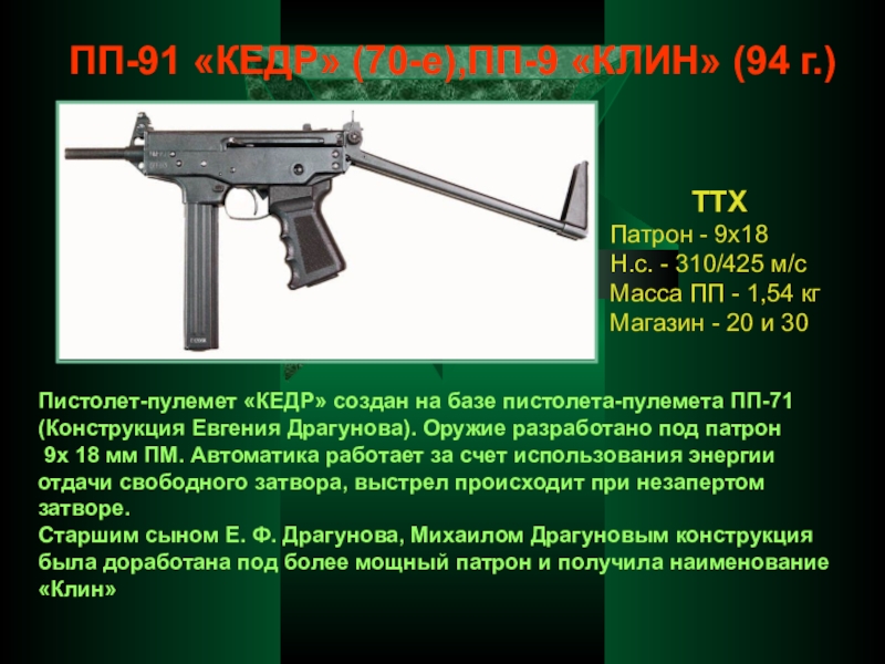 Пистолет-пулемет «КЕДР» создан на базе пистолета-пулемета ПП-71 (Конструкция Евгения Драгунова). Оружие разработано под патрон
