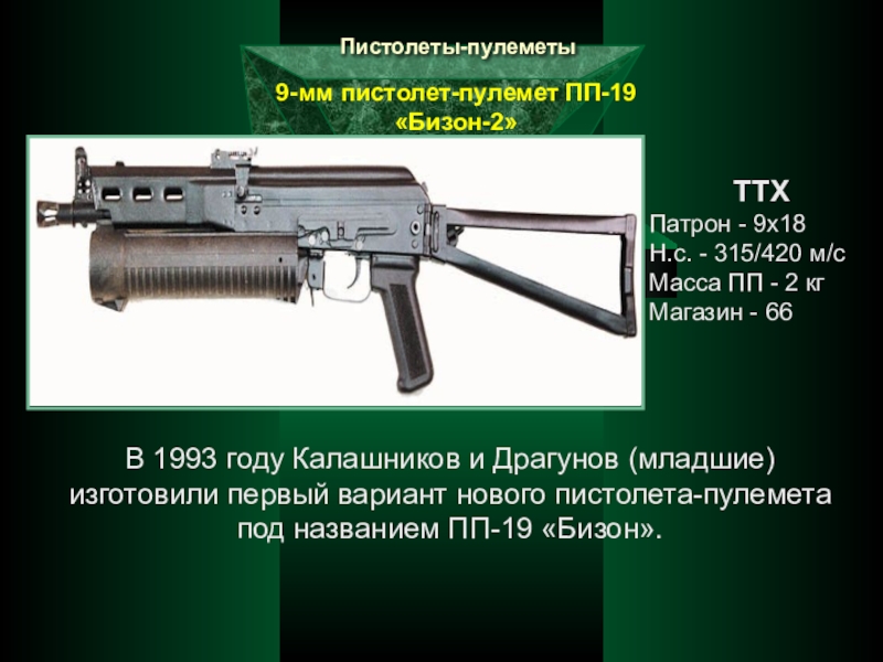 В 1993 году Калашников и Драгунов (младшие) изготовили первый вариант нового пистолета-пулемета под названием ПП-19 «Бизон».