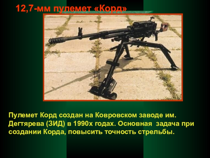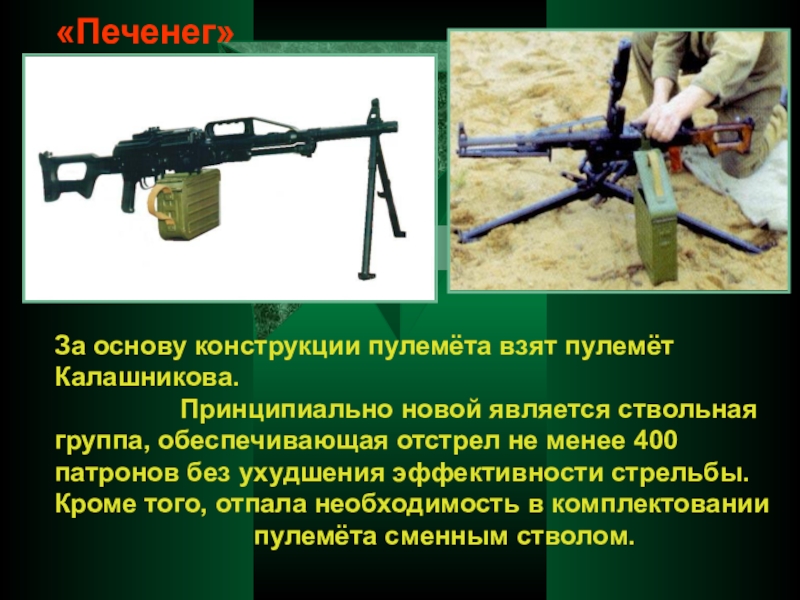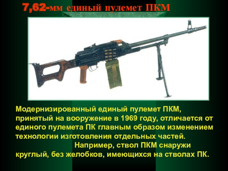 В 1946 г. М.Т. Калашников разработал образец, на базе которого был отработан автомат, поступивший в 1949 году на вооружение Советской Армии. В 1959 году принят на вооружение автомат АКМ (модернизированный), в 1974 году – 5,45-мм автомат АК74 и ручной пулемет РПК74 и их модификации,