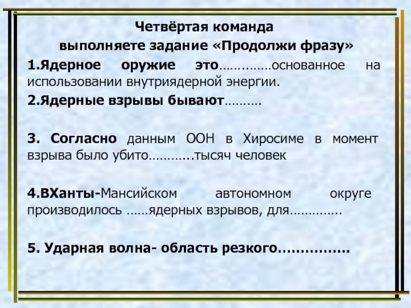 4.ВХанты-Мансийском автономном округе производилось ……ядерных взрывов, для…………..