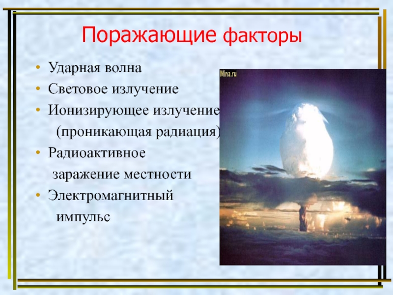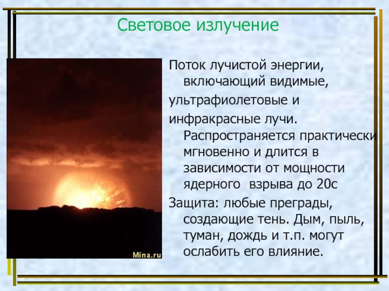 инфракрасные лучи. Распространяется практически мгновенно и длится в зависимости от мощности ядерного взрыва до 20с