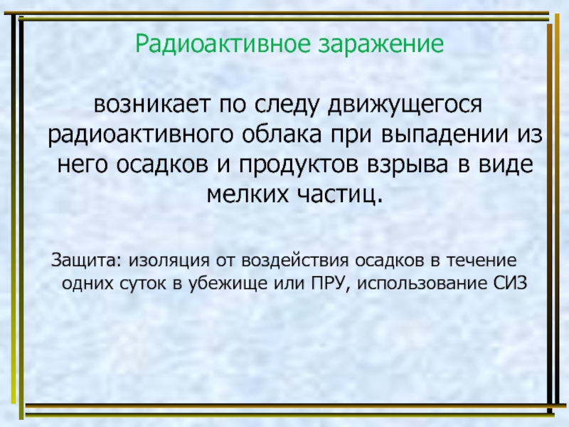 Защита: изоляция от воздействия осадков в течение одних суток в убежище или ПРУ, использование СИЗ