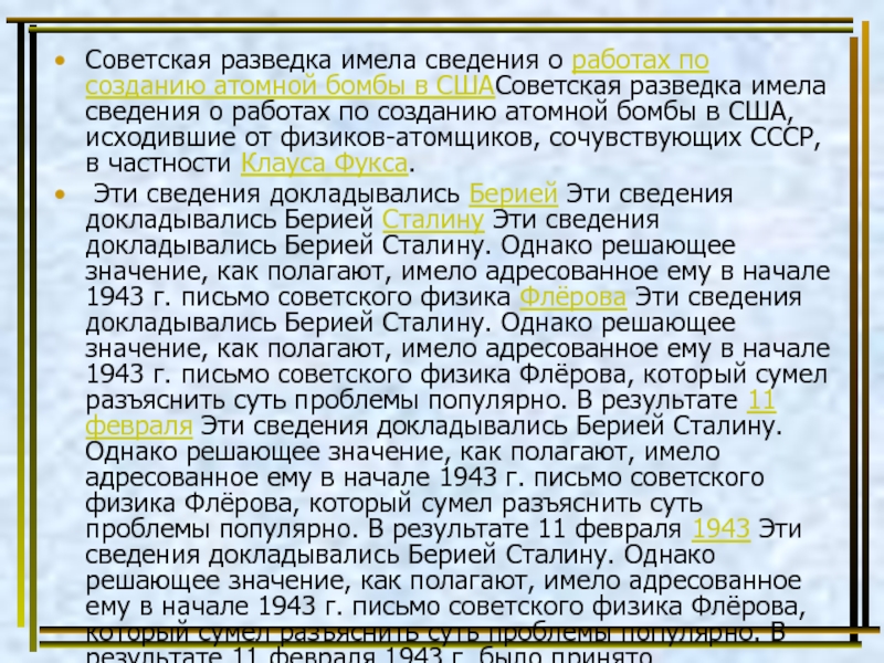 Эти сведения докладывались Берией Эти сведения докладывались Берией Сталину Эти сведения докладывались Берией Сталину. Однако решающее значение, как полагают, имело адресованное ему в начале 1943 г. письмо советского физика Флёрова Эти сведения докладывались Берией Сталину. Однако решающее значение, как полагают, имело адресованное ему в начале 1943 г. письмо советского физика Флёрова, который сумел разъяснить суть проблемы популярно. В результате 11 февраля Эти сведения докладывались Берией Сталину. Однако решающее значение, как полагают, имело адресованное ему в начале 1943 г. письмо советского физика Флёрова, который сумел разъяснить суть проблемы популярно. В результате 11 февраля 1943 Эти сведения докладывались Берией Сталину. Однако решающее значение, как полагают, имело адресованное ему в начале 1943 г. письмо советского физика Флёрова, который сумел разъяснить суть проблемы популярно. В результате 11 февраля 1943 г. было принято постановление ГКО о начале работ по созданию атомной бомбы.