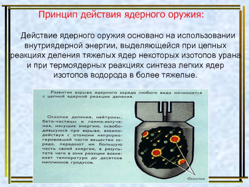 Слайд 13Ядерное оружие - в момент взрыва происходит ядерная реакция деления тяжёлых