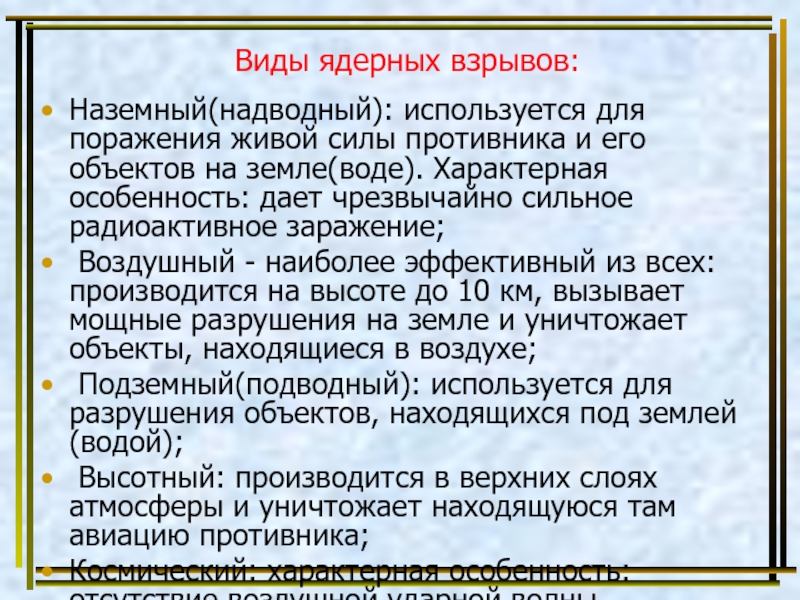 Воздушный - наиболее эффективный из всех: производится на высоте до 10 км, вызывает мощные разрушения на земле и уничтожает объекты, находящиеся в воздухе;