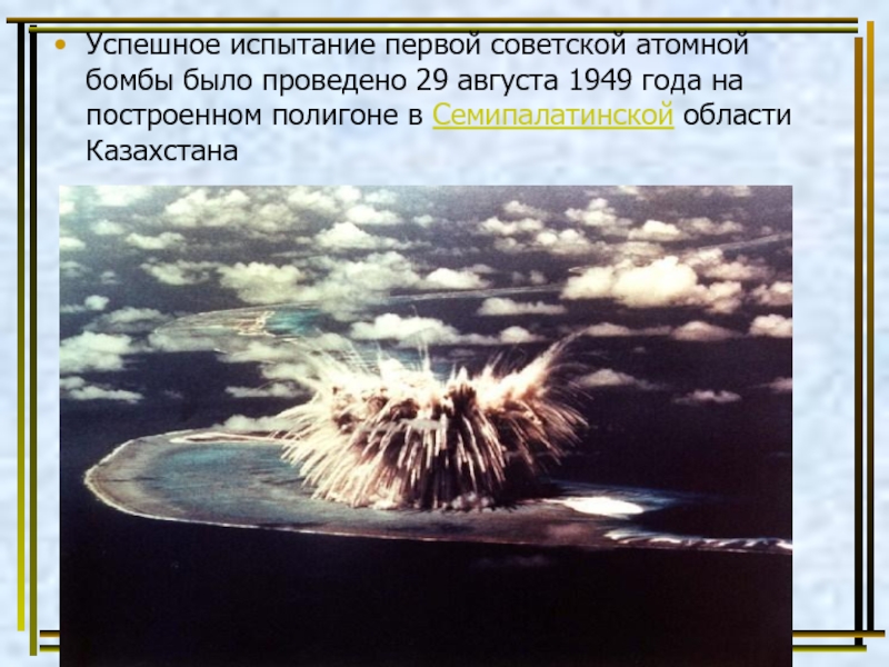 Слайд 29Успешное испытание первой советской атомной бомбы было проведено 29 августа 1949