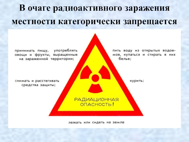 Слайд 25В очаге радиоактивного заражения местности категорически запрещается