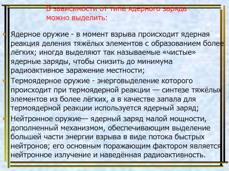 элементов с образованием более лёгких; иногда выделяют так называемые «чистые» ядерные заряды, чтобы снизить до минимума радиоактивное заражение местности;
