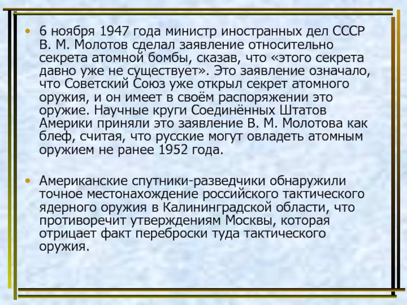 сделал заявление относительно секрета атомной бомбы, сказав, что «этого секрета давно уже не существует». Это заявление означало, что Советский Союз уже открыл секрет атомного оружия, и он имеет в своём распоряжении это оружие. Научные круги Соединённых Штатов Америки приняли это заявление В. М. Молотова как блеф, считая, что русские могут овладеть атомным оружием не ранее 1952 года.