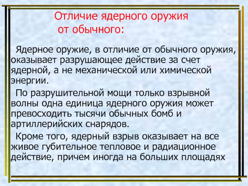 Кроме того, ядерный взрыв оказывает на все живое губительное тепловое и радиационное действие, причем иногда на больших площадях.