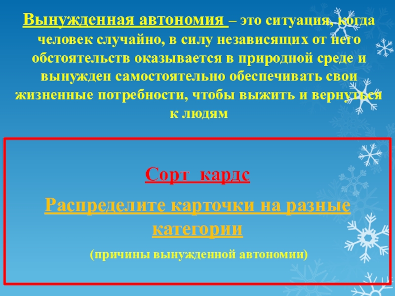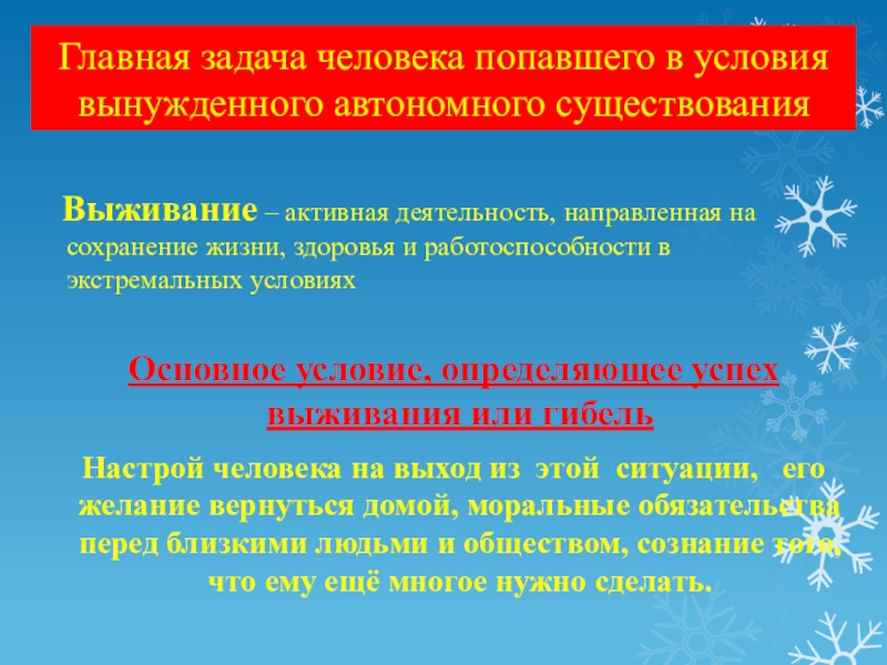 Вскоре пошел мокрый снег, и надо было идти дальше. «Он уже не думал ни о Стране Маленьких Палок, ни о Билле, ни о тайнике у реки Диз. Им владело только одно желание: есть!» Ночью снег превратился в холодный дождь. Наступил день — серый день без солнца. Теперь дождя уже не было. Чувство голода притупилось, и осталась лишь тупая, ноющая боль в желудке. Зато мысли стали яснее, и он опять думал о Стране Маленьких Палок и о своем тайнике у реки Диз. Когда проглянуло солнце, путнику удалось определить стороны света. Это не очень помогло, поскольку он теперь уже точно знал, что сбился с пути.