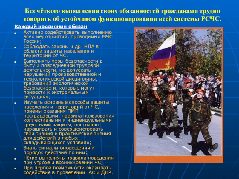 Без чёткого выполнения своих обязанностей гражданами трудно говорить об устойчивом функционировании всей системы РСЧС. Каждый россиянин обязанАктивно