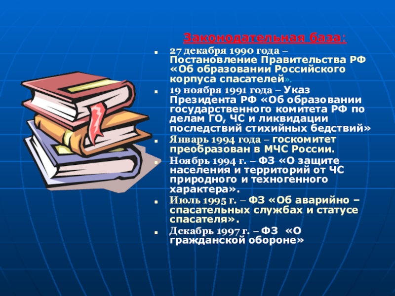Законодательная база:27 декабря 1990 года – Постановление Правительства РФ «Об образовании Российского корпуса спасателей».19 ноября 1991 года