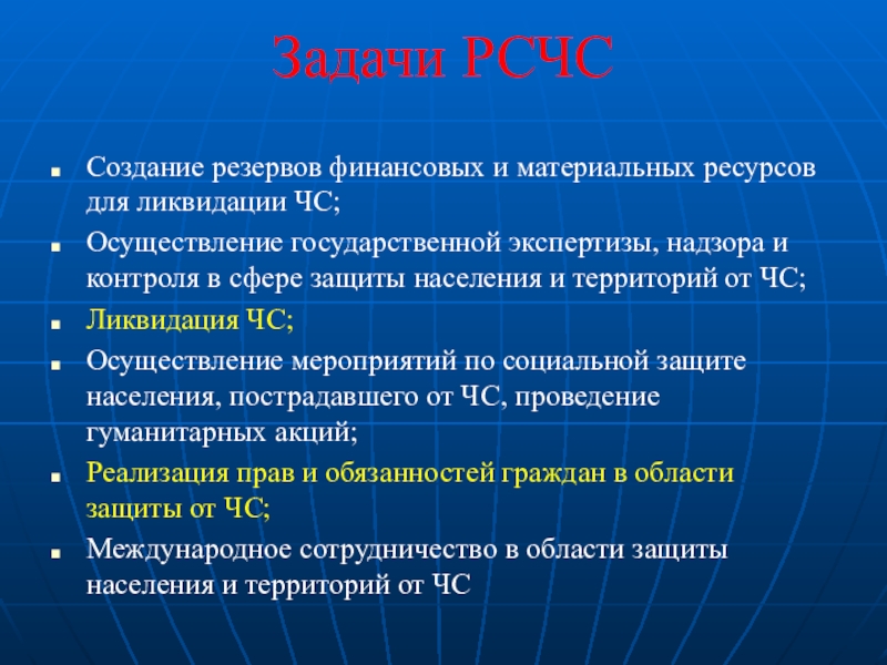 Задачи РСЧС Разработка и реализация законов и других важных документов, регулирующих вопросы защиты населения и территорий от