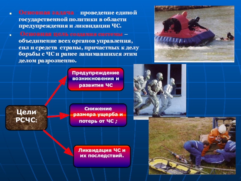 Основная задача – проведение единой государственной политики в области предупреждения и ликвидации ЧС. Основная цель создания системы