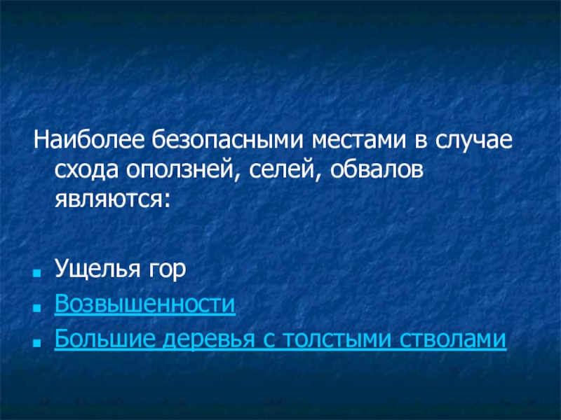 Наиболее безопасными местами в случае схода оползней, селей, обвалов являются:Ущелья горВозвышенностиБольшие деревья с толстыми стволами
