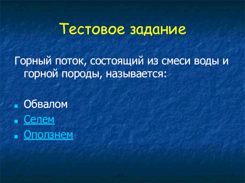Тестовое заданиеГорный поток, состоящий из смеси воды и горной породы, называется:ОбваломСелемОползнем
