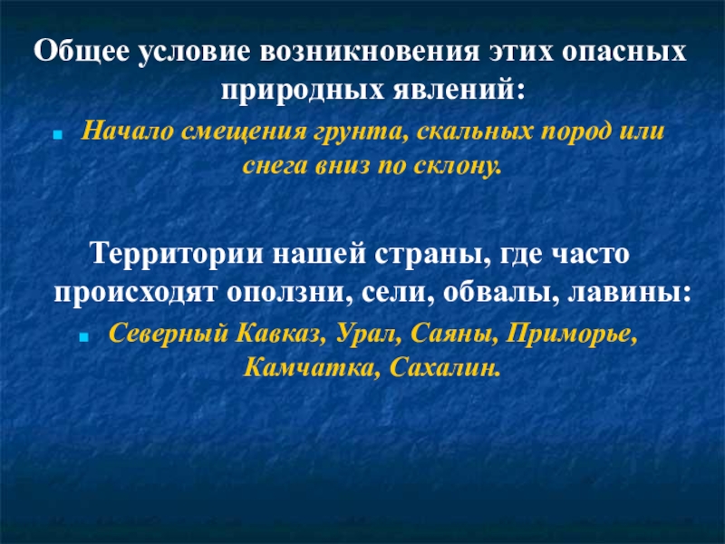 Общее условие возникновения этих опасных природных явлений:Начало смещения грунта, скальных пород или снега вниз по склону.Территории нашей страны, где часто происходят оползни, сели, обвалы, лавины:Северный Кавказ, Урал, Саяны, Приморье, Камчатка, Сахалин.