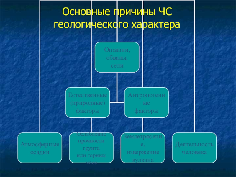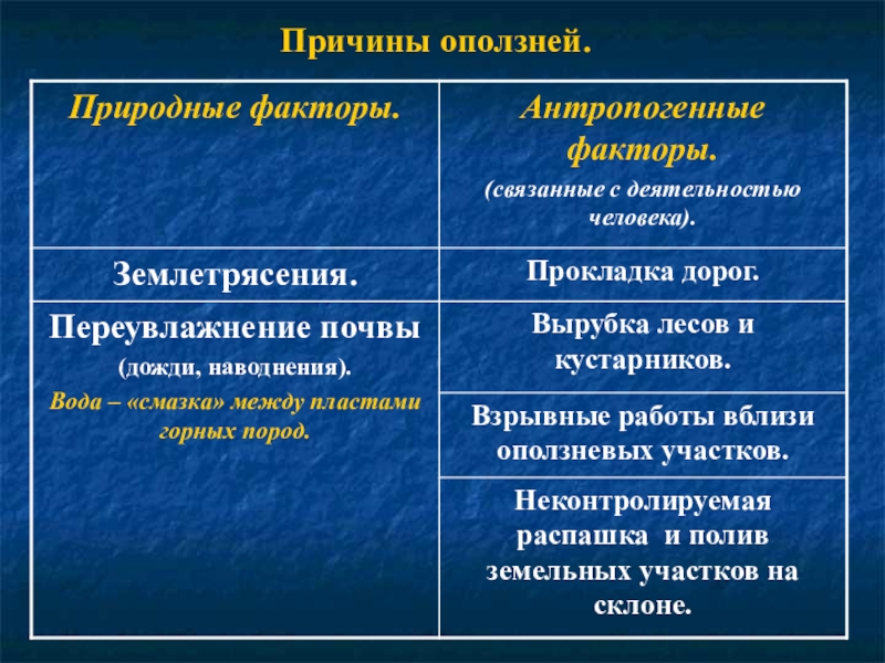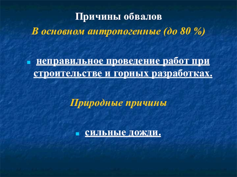 Причины обваловВ основном антропогенные (до 80 %)неправильное проведение работ при строительстве и горных разработках. Природные причинысильные дожди.