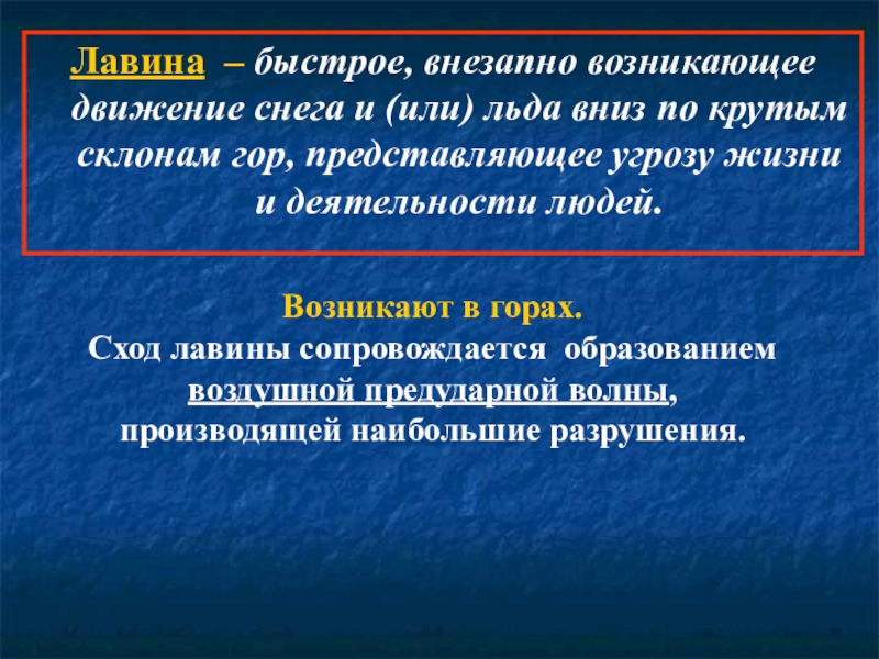 Слайд 16Лавина – быстрое, внезапно возникающее движение снега и (или) льда вниз