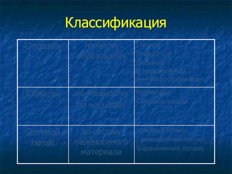 Общее условие возникновения этих опасных природных явлений:Начало смещения грунта, скальных пород или снега вниз по склону.Территории нашей