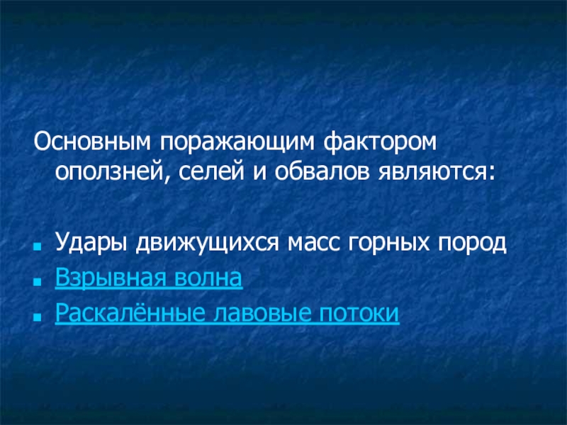 Основным поражающим фактором оползней, селей и обвалов являются:Удары движущихся масс горных породВзрывная волнаРаскалённые лавовые потоки