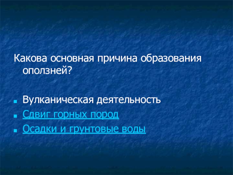 Какова основная причина образования оползней?Вулканическая деятельностьСдвиг горных породОсадки и грунтовые воды