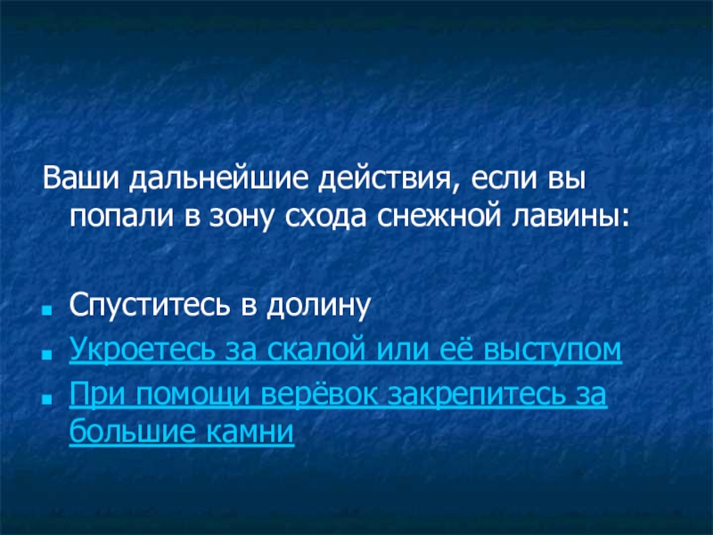 Ваши дальнейшие действия, если вы попали в зону схода снежной лавины:Спуститесь в долинуУкроетесь за скалой или её