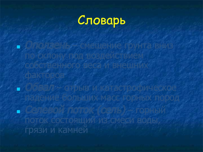 СловарьОползень – смещение грунта вниз по склону под воздействием собственного веса и внешних факторовОбвал – отрыв и