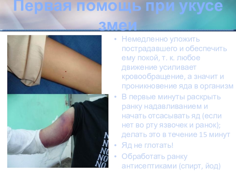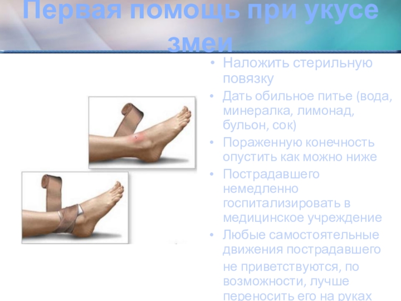 Слайд 10Первая помощь при укусе змеи