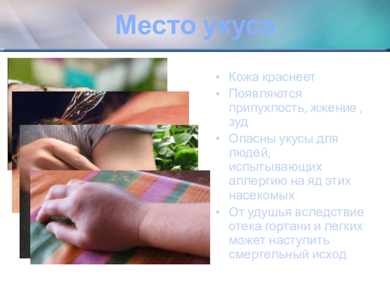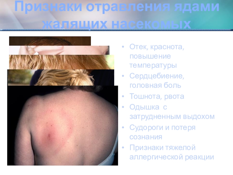Слайд 24Признаки отравления ядами жалящих насекомых