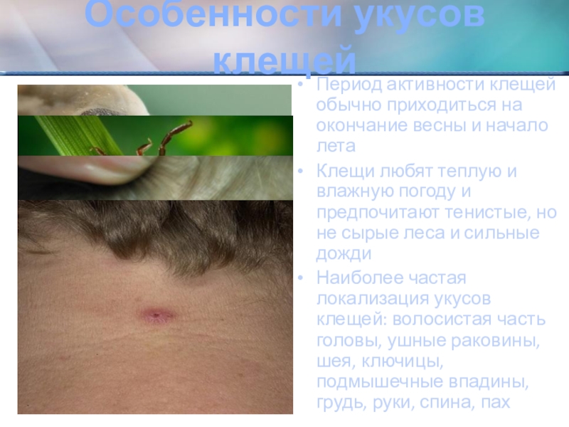 Наиболее частая локализация укусов клещей: волосистая часть головы, ушные раковины, шея, ключицы, подмышечные впадины, грудь, руки, спина, пах