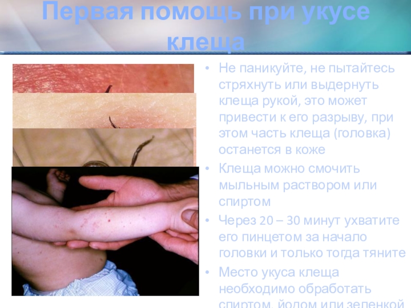 Слайд 17Первая помощь при укусе клеща