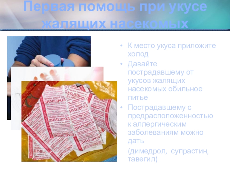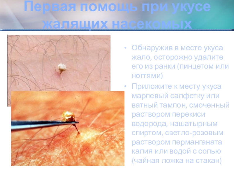 Слайд 23Первая помощь при укусе жалящих насекомых