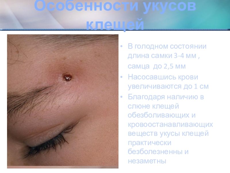 Слайд 14Особенности укусов клещей