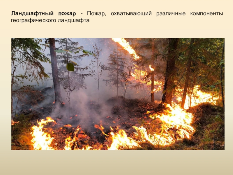 Слайд 8Ландшафтный пожар - Пожар, охватывающий различные компоненты географического ландшафта