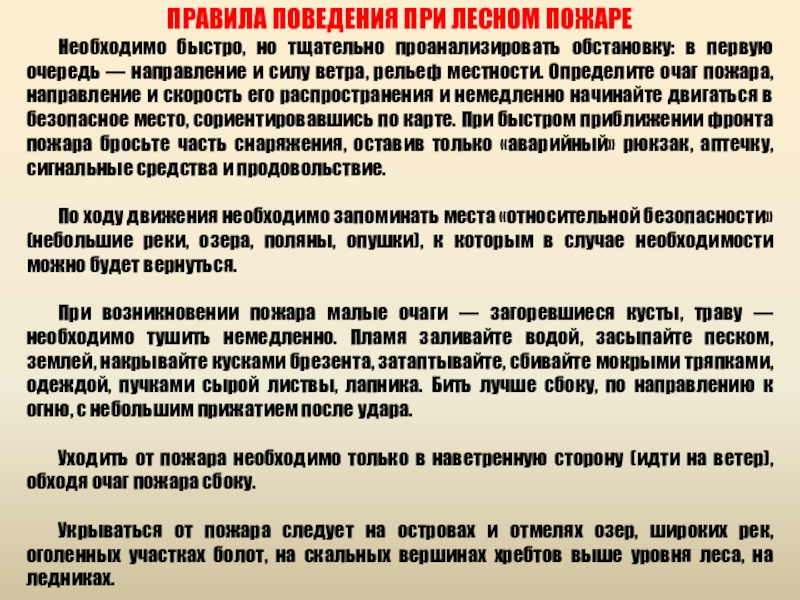 первую очередь — направление и силу ветра, рельеф местности. Определите очаг пожара, направление и скорость его распространения и немедленно начинайте двигаться в безопасное место, сориентировавшись по карте. При быстром приближении фронта пожара бросьте часть снаряжения, оставив только «аварийный» рюкзак, аптечку, сигнальные средства и продовольствие.