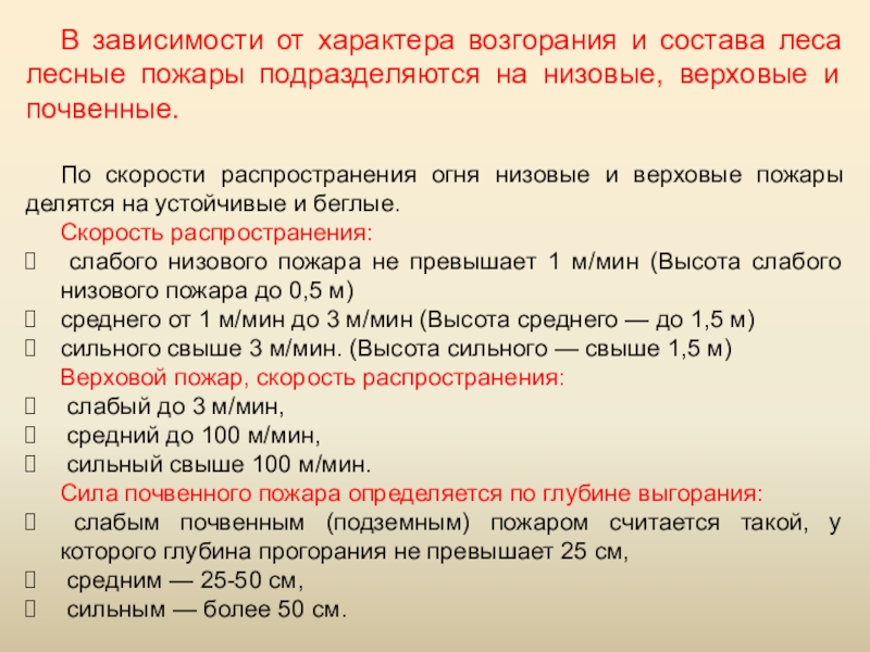 Слайд 13В зависимости от характера возгорания и состава леса лесные пожары подразделяются
