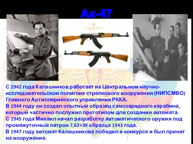 Слайд 5С 1942 года Калашников работает на Центральном научно-исследовательском полигоне стрелкового вооружения