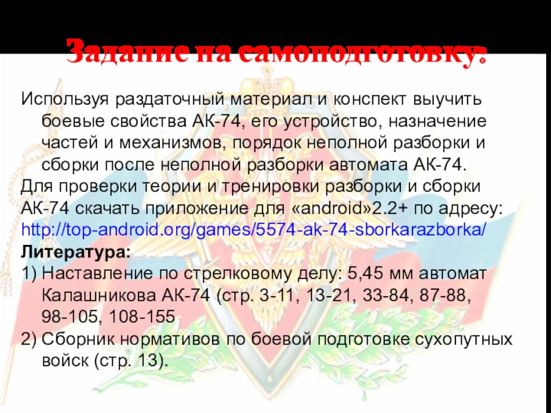 1) Наставление по стрелковому делу: 5,45 мм автомат Калашникова АК-74 (стр. 3-11, 13-21, 33-84, 87-88, 98-105, 108-155