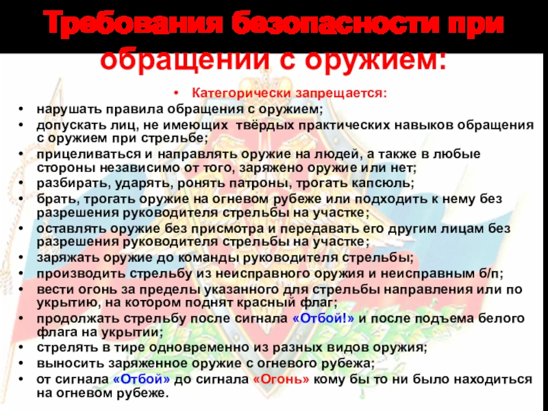 Слайд 41Требования безопасности при обращении с оружием: