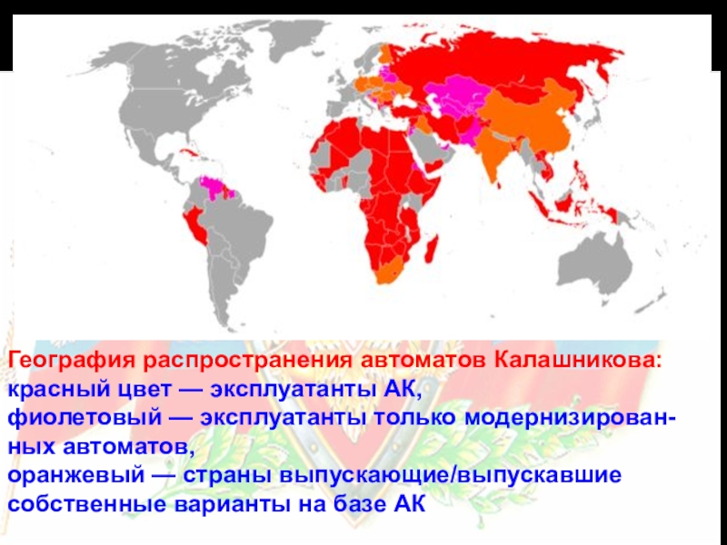 Слайд 7География распространения автоматов Калашникова: красный цвет — эксплуатанты АК,