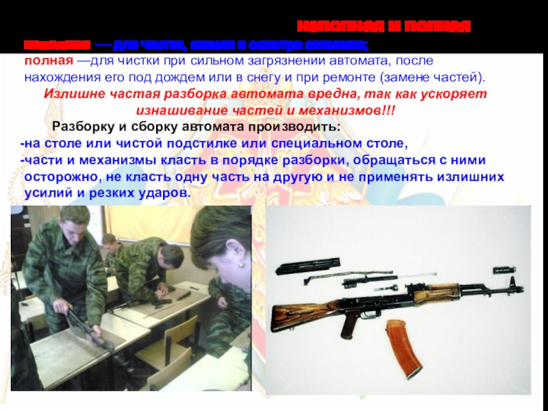 полная —для чистки при сильном загрязнении автомата, после нахождения его под дождем или в снегу и при ремонте (замене частей).