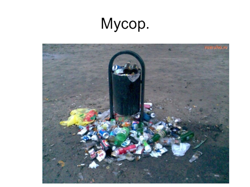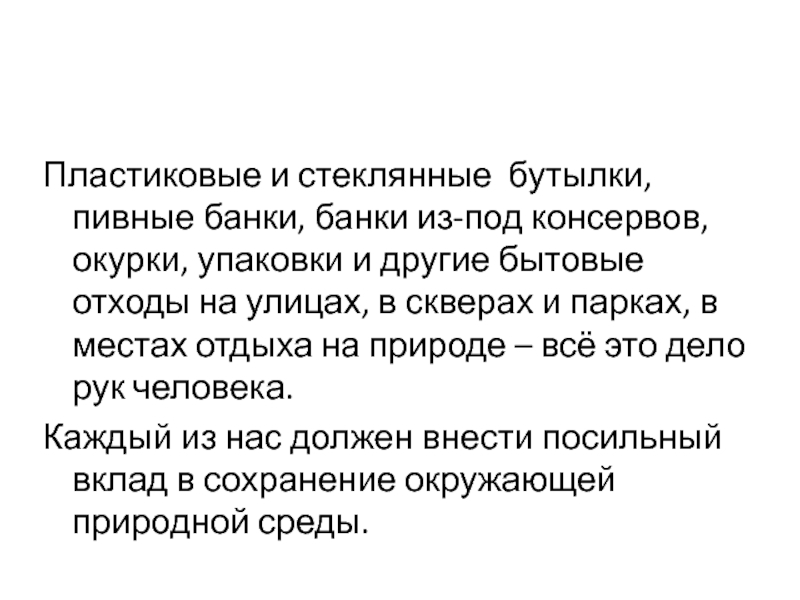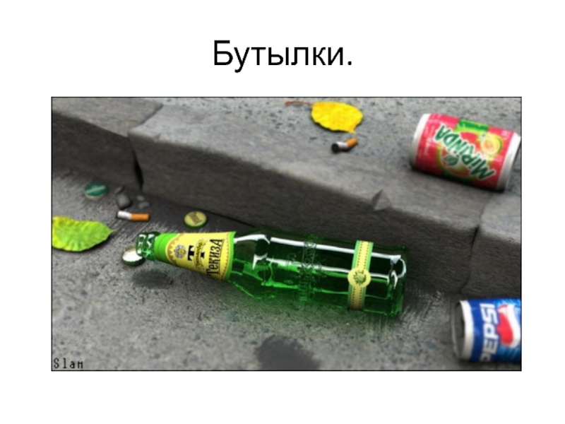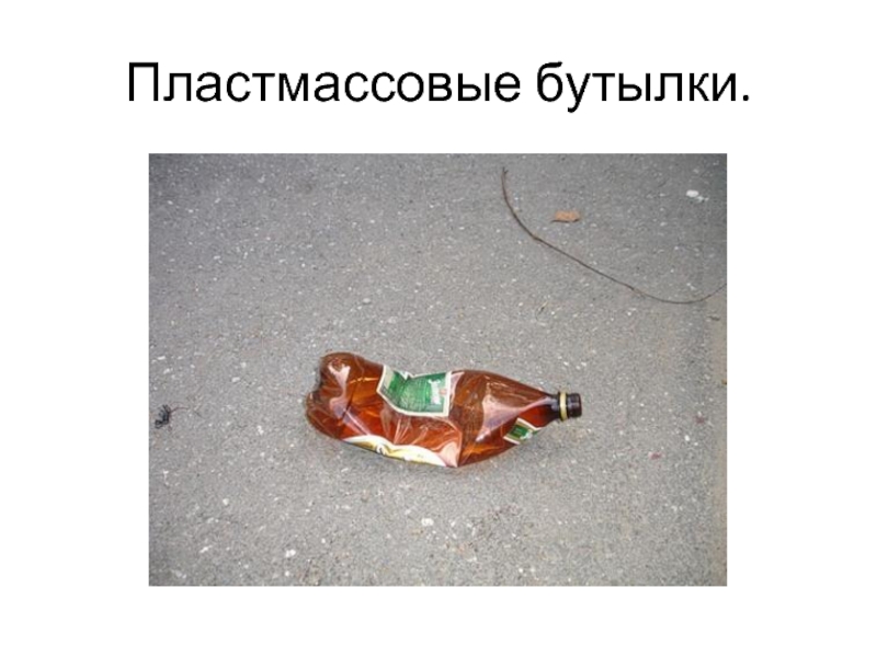 Слайд 25Пластиковые и стеклянные бутылки, пивные банки, банки из-под консервов, окурки, упаковки