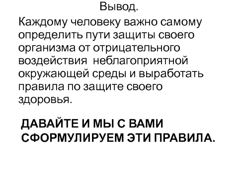определить пути защиты своего организма от отрицательного воздействия неблагоприятной окружающей среды и выработать правила по защите своего здоровья.