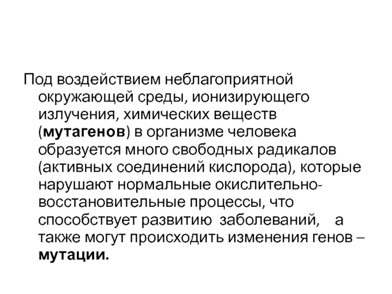 организме человека образуется много свободных радикалов (активных соединений кислорода), которые нарушают нормальные окислительно-восстановительные процессы, что способствует развитию заболеваний, а также могут происходить изменения генов – мутации.